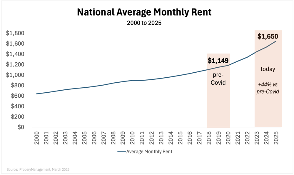 • Rising rents: With national rental vacancy rates hovering at just 7.0%, according to the Census Bureau, landlords maintain pricing power. Rents increased 44% from pre-Covid levels and 7.5% year-over-year, per iPropertyManagement. See the “National Average Monthly Rent” chart for details.