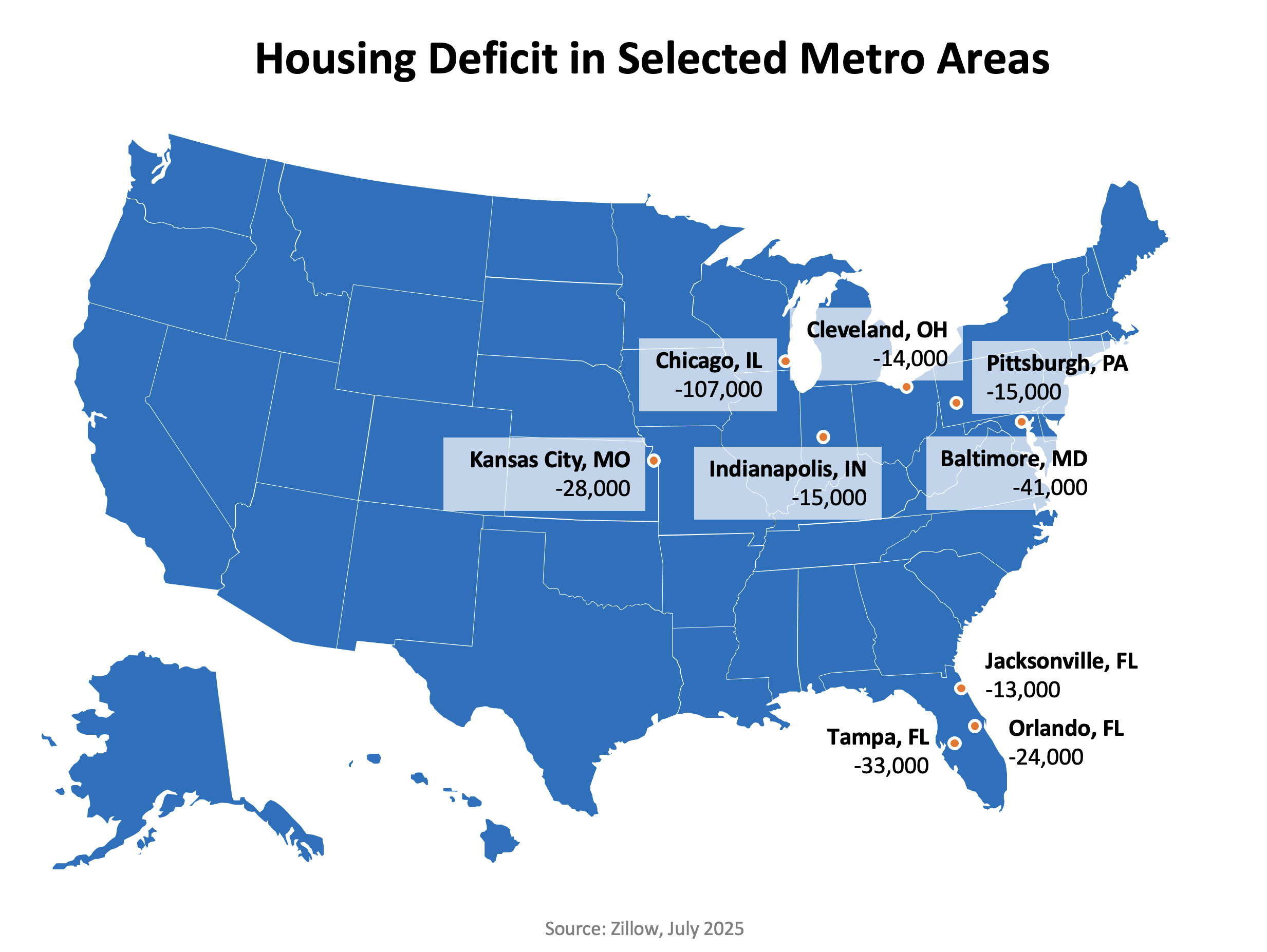 • Chicago, IL – Even with slower population growth, Chicago faces a shortage of roughly 107,000 homes, according to Zillow estimates, as construction fails to offset aging housing stock.